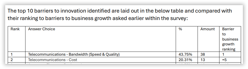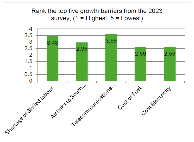 What is particularly striking in the 2025 results is the breadth of businesses affected. Telecommunications is not confined to one sector or business type. Twelve primary sectors selected bandwidth speed and quality as a growth constraint, including tourism, transport, finance, energy-related services and communications itself. In several sectors, every single responding business identified telecommunications as a barrier. This underlines that connectivity is now foundational infrastructure, not an optional enhancement.