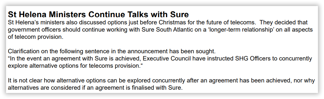 However, under the transitional provisions of the new Communications Ordinance, approved by the St Helena Legislative Council in June 2025, all licences issued to Sure South Atlantic under the Telecommunications Ordinance 1989 remain valid and in full force until 31 March 2026.